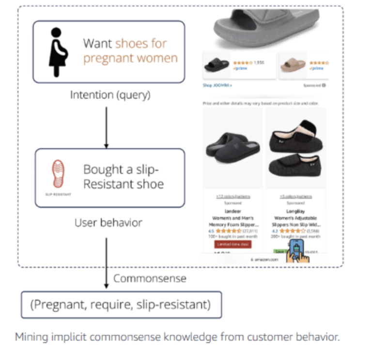 To quote Amazon Science: “COSMO involves a recursive procedure in which an LLM generates hypotheses about the common-sense of implications of query-purchase and co-purchase data; a combination of human annotation and machine learning models filters out the low-quality hypotheses; human reviewers extract guiding principles from the high-quality hypotheses; and instructions based on those principles are used to prompt the LLM”. To put it more simply, COSMO infers customer intent via a training cycle where an AI system makes predictions, gets feedback, and uses the learnings to make better predictions guesses moving forward. Amazon science explains the functionality: “If a customer, for instance, submits a query for “shoes for pregnant women”, the recommendation engine should be able to deduce that pregnant women might want slip-resistant shoes. We’re building a knowledge graph that encodes relationships between products in the Amazon Store and the human contexts in which they play a role — their functions, their audiences, the locations in which they’re used, and the like. For instance, the knowledge graph might use the used_for_audience relationship to link slip-resistant shoes and pregnant women.”